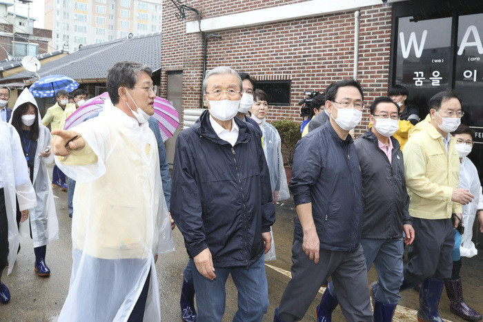 ▲ 김종인 비상대책위원장과 주호영 원내대표를 비롯한 당지도부는 10일 오후 전남 구례군 구례 5일시장을 방문해 수해 현장을 점검하고 있다. (사진=미래통합당 제공) |