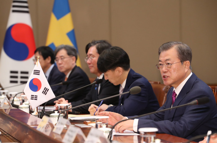▲ 발언하는 문 대통령 문재인 대통령이 18일 오후 청와대에서 스테판 뢰벤 스웨덴 총리와 정상회담을 하고 있다. [연합뉴스 제공] |