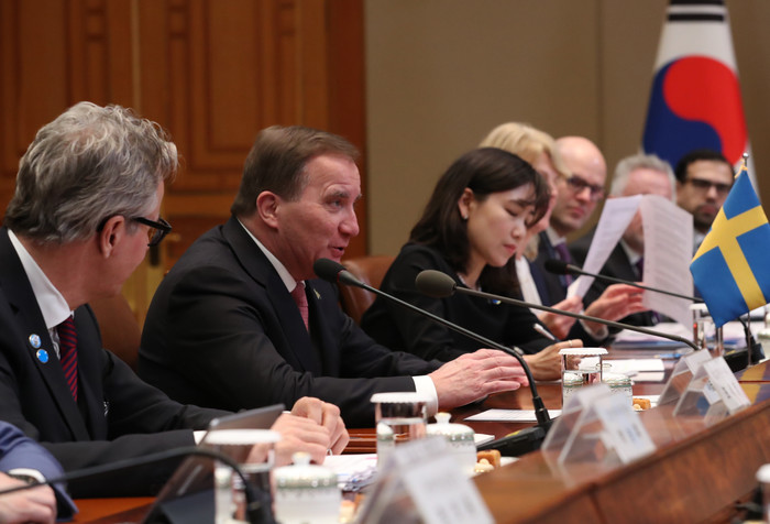 ▲ 발언하는 스웨덴 총리 스테판 뢰벤 스웨덴 총리가 18일 오후 청와대에서 문재인 대통령과 정상회담을 하고 있다. [연합뉴스 제공] |