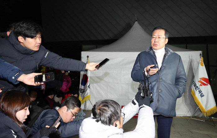 ▲ 단식 중인 황교안 대표 찾은 홍준표 자유한국당 홍준표 전 대표가 25일 오후 청와대 분수대 앞에서 단식 투쟁 중인 황교안 대표를 만난 뒤 취재진과 인터뷰하고 있다. 연합뉴스 제공 |