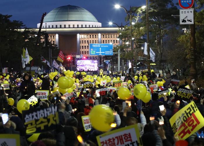 | ▲국회 앞의 검찰개혁 촉구 촛불 14일 오후 서울 여의도 국회 앞에서 열린 '제15차 사법적폐청산을 위한 검찰개혁 춧불 문화제'에서 참가자들이 촛불과 노란 풍선을 흔들며 구호를 외치고 있다. 2019.12.14 연합뉴스 제공 |