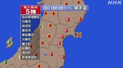 | ▲ 20일 일본 미야기현 인근과 도호쿠(東北) 지역에 발생한 지진 강도 현황/ 사진= NHK 갈무리. |